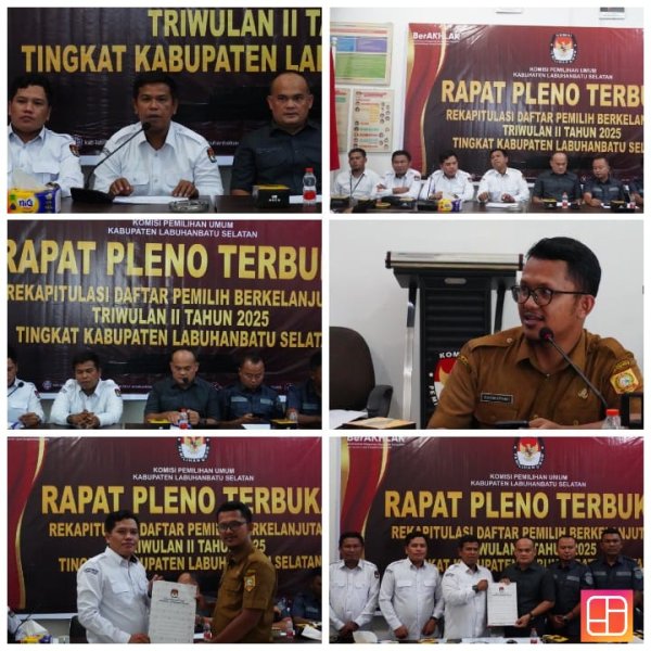 Komisi Pemilihan Umum Kabupaten Labuhanbatu Selatan melaksanakan Rapat Pleno Terbuka Rekapitulasi dan Penetapan Data Pemilih Berkelanjutan Triwulan II Tahun 2025 di Tingkat Kabupaten Labuhanbatu Selatan Pada hari Senin (30/6/2025) di Kantor Komisi Pemilihan Umum Kabupaten Labuhanbatu Selatan. Rapat tersebut dipimpin oleh Ketua Komisi Pemilihan Umum Kabupaten Labuhanbatu Selatan Adnan Rasyid didampingi oleh Anggota Komisi Pemilihan Umum Kabupaten Labuhanbatu Selatan, Plt.Sekretaris dan jajarannya di Lingkungan Komisi Pemilihan Umum Kabupaten Labuhanbatu Selatan. Dalam kegiatan ini turut hadir Ketua dan Anggota Bawaslu Kabupaten Labuhanbatu Selatan dan Perwakilan dari Dinas Kependudukan dan Pencatatan Sipil Kabupaten Labuhanbatu Selatan. Hasil dari Rapat Pleno Rekapitulasi dan Penetapan Data Pemilih Berkelanjutan Triwulan II Tahun 2025 Tingkat Kabupaten Labuhanbatu Selatan antara lain jumlah pemilih laki-laki sebanyak 114.493 orang dan jumlah pemilih perempuan sebanyak 112.012 orang tersebar di 5 Kecamatan, 52 Desa dan 2 Kelurahan. ....