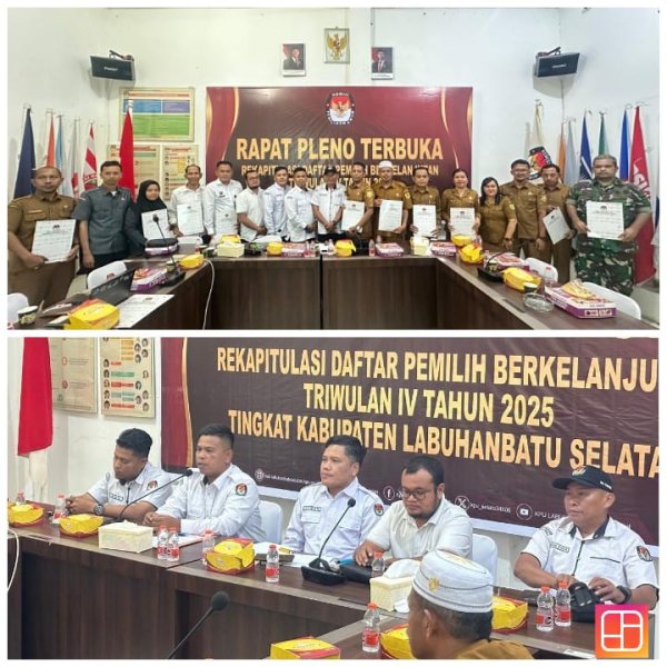 Komisi Pemilihan Umum (KPU) Kabupaten Labuhanbatu Selatan menunjukkan komitmen penuh terhadap akuntabilitas dan transparansi data pemilih dengan menyelenggarakan Rapat Pleno Terbuka Rekapitulasi Pemutakhiran Data Pemilih Berkelanjutan (PDPB) Triwulan IV Tahun 2025. Acara penting ini dilaksanakan pada Kamis, 8 Desember 2025 pukul 10.00 WIB, bertempat di Aula Kantor KPU Kabupaten Labuhanbatu Selatan. Rapat Pleno dipimpin secara langsung oleh Ketua KPU Labuhanbatu Selatan, Adnan Rasyid, S.Sos didampingi seluruh jajaran Anggota KPU Kabupaten Labuhanbatu Selatan. Pelaksanaan teknis dan pemaparan hasil rekapitulasi disajikan secara detail oleh Ketua Divisi Perencanaan Data dan Informasi, Aswan Efendi, S.Pd.I, M.Pd. Rapat Pleno ini secara strategis melibatkan seluruh pemangku kepentingan utama, yaitu Bawaslu Kabupaten Labuhanbatu Selatan untuk pengawasan, serta perwakilan dari unsur Forkopimda dan Instansi terkait, seperti Disdukcapil Kabupaten Labuhanbatu Selatan, Polres Labuhanbatu Selatan, Danramil 11 Kotapinang, Kesbangpol Kabupaten Labuhanbatu Selatan, Camat se-Kabupaten Labuhanbatu Selatan, dan Perwakilan dari Lembaga Pemasyarakatan Kelas III Kotapinang. Pentingnya kerjasama antar instansi, khususnya terkait pemilih yang telah meninggal dunia. Diharapkan, camat dapat mengkoordinasikan data pemilih yang meninggal dunia dengan Kepala Desa untuk melaporkan dan mengeluarkan surat kematian. Disdukcapil juga dapat menindaklanjuti surat kematian tersebut untuk dapat dikeluarkan akta kematian sesuai dengan persyaratan administrasi yang telah ditetapkan oleh Disdukcapil. Rapat Pleno tersebut menghasilkan usulan untuk dilakukan MoU antara KPU dan Instansi terkait dalam menyelesaikan pemilih yang Meninggal Dunia, Pindah Masuk, Pindah Keluar, data TNI/POLRI serta pencatatan kependudukan lainnya. KPU Labuhanbatu Selatan juga menerima masukan dan tanggapan dari seluruh peserta rapat yang hadir, yang pada intinya menyampaikan bahwa seluruh pihak turut mendukung kegiatan pemutakhiran data berkelanjutan ini guna memastikan data pemilih terkhusus di Kabupaten Labuhanbatu Selatan ini menjadi lebih baik dan akurat. Berdasarkan hasil pemutakhiran yang cermat selama Triwulan IV (Bulan Oktober- Bulan November) tahun 2025, Ketua Divisi Perencanaan, Data dan Informasi Aswan Efendi,S.Pd.I, M.Pd memaparkan hasil Rekapitulasi secara keseluruhan, total Daftar Pemilih Berkelanjutan (DPB) Triwulan IV Tahun 2025 di Kabupaten Labuhanbatu Selatan ditetapkan sebanyak 232.660 pemilih, yang terdiri dari 117.607 pemilih Laki-Laki dan 115.053 pemilih Perempuan. Data ini tersebar di 5 Kecamatan, 54 Desa/Kelurahan, menjadikannya basis data yang kokoh untuk persiapan Pemilu dan Pemilihan Kepala Daerah yang akan datang. Kegiatan Pemutakhiran data pemilih berkelanjutan Tahun 2025 ini dilaksanakan rutin setiap 3 bulan sekali, yang mana pada awal bulan April Tahun 2026 akan Kembali dilakukan kegiatan yang sama untuk rekapitulasi triwulan ke 1. Rapat Pleno ditutup dengan penyerahan Surat Keputusan (SK) Rekapitulasi oleh KPU Kabupaten Labuhanbatu Selatan kepada seluruh Stakeholder yang hadir. ....