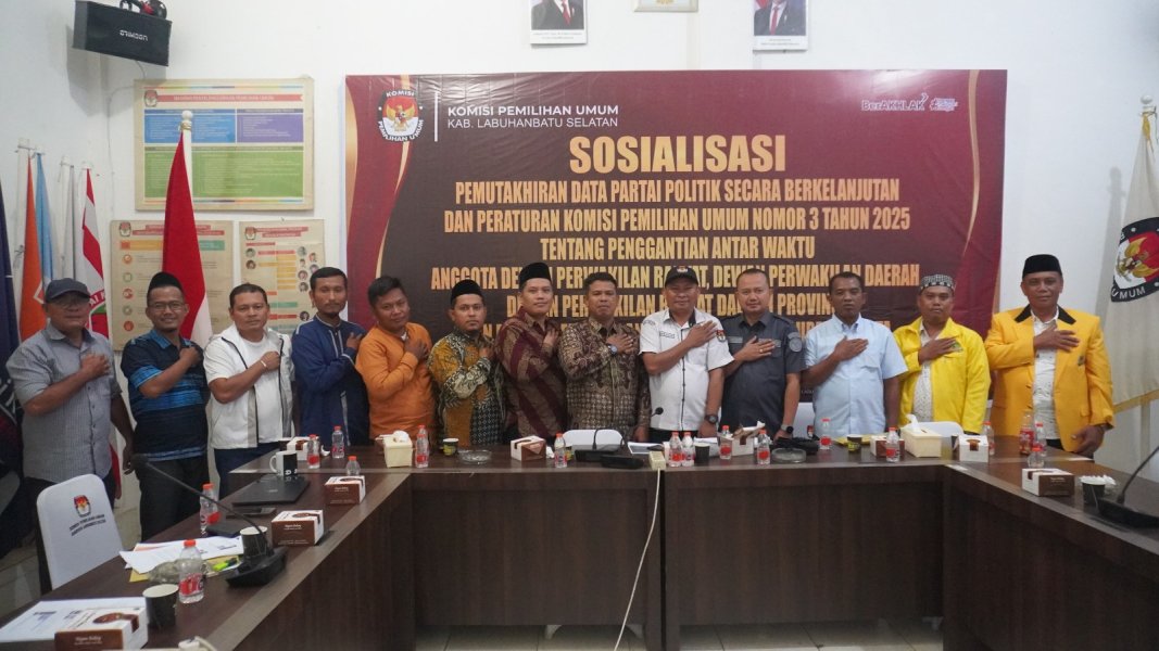 KPU Kabupaten Labuhanbatu Selatan melaksanakan Sosialisasi Pemutakhiran Data Partai Politik secara Berkelanjutan dan Peraturan Komisi Pemilihan Umum Nomor 3 Tahun 2025 tentang Penggantian Antar Waktu Anggota DPR, DPD, DPRD Provinsi, dan DPRD Kab/Kota di Lingkungan KPU Kabupaten Labuhanbatu Selatan pada Senin, 22 Desember 2025 di Kantor KPU Kabupaten Labuhanbatu Selatan. Kegiatan dibuka oleh Ketua KPU Kabupaten Labuhanbatu Selatan Adnan Rasyid dan dihadiri oleh Badan Pengawas Pemilihan Umum Kabupaten Labuhanbatu Selatan serta Partai Politik Peserta Pemilu Tahun 2024 di Kabupaten Labuhanbatu Selatan. Pemaparan materi Sosialisasi Pemutakhiran Data Partai Politik secara Berkelanjutan melalui SIPOL Semester II Tahun 2025 disampaikan oleh Ketua Divisi Teknis Penyelenggaraan Pemilu Eben Ezer Lumbantoruan. Dalam pemaparannya, beliau menyampaikan berdasarkan Pasal 146 PKPU Nomor 4 Tahun 2022 data partai politik yang dimutakhirkan secara berkelanjutan meliputi: kepengurusan Partai Politik pada tingkat pusat, provinsi, kabupaten/kota, dan kecamatan; keterwakilan perempuan pada kepengurusan Partai Politik tingkat pusat, provinsi, dan kabupaten/kota; keanggotaan Partai Politik; dan domisili Kantor Tetap untuk kepengurusan Partai Politik pada tingkat pusat, provinsi, dan kabupaten/kota. Penyampaian hasil pemutakhiran Semester II Tahun 2025 kepada KPU melalui SIPOL disampaikan paling lambat tanggal 26 Desember Tahun 2025 tentang Penggantian Antar Waktu Selanjutnya, beliau juga menyampaikan mengenai rumusan kebijakan baru pada Peraturan Komisi Pemilihan Umum Nomor 3 Tahun 2025 meliputi ketentuan anggota DPRD yang berhenti antarwaktu, anggota DPRD yang diberhentikan melakukan upaya hukum, penerapan mekanisme afirmasi perempuan, ketentuan calon PAW yang tidak memenuhi syarat, LHKPN bagi calon PAW, klarifikasi calon PAW, dan upaya hukum calon PAW. Beliau menekankan bahwa penetapan calon PAW harus berdasarkan perolehan suara terbanyak berikutnya dalam partai dan daerah pemilihan yang sama. Dalam kondisi tertentu, seperti kesamaan jumlah suara, PKPU telah menyediakan mekanisme berjenjang yang merujuk pada persebaran suara di tingkat kecamatan, kelurahan, hingga TPS, serta mempertimbangkan afirmasi keterwakilan perempuan apabila semua variabel memiliki nilai yang sama. Kegiatan sosialisasi ini diharapkan dapat meningkatkan kesiapan Partai Politik dalam melakukan pemutakhiran data partai politik serta pemahaman terhadap Peraturan Komisi Pemilihan Umum Nomor 3 Tahun 2025. ....