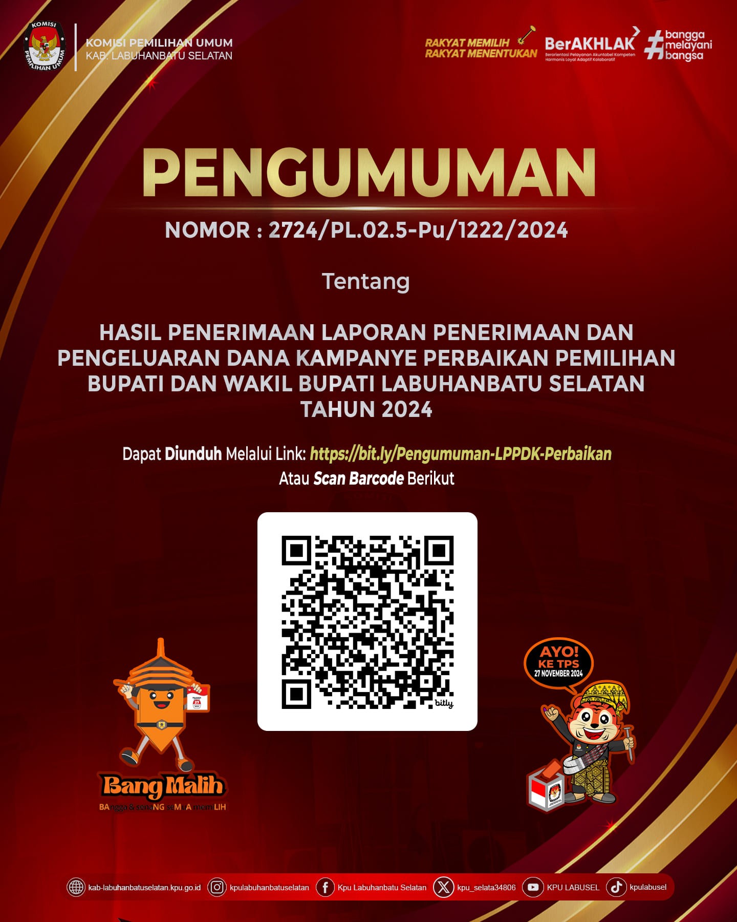 #TemanPemilih, Berikut kami sampaikan Pengumuman Nomor : 2724/PL.02.5-Pu/1222/2024 tentang Hasil Penerimaan Laporan Penerimaan dan Pengeluaran Dana Kampanye Perbaikan Pemilihan Bupati dan Wakil Bupati Labuhanbatu Selatan Tahun 2024.