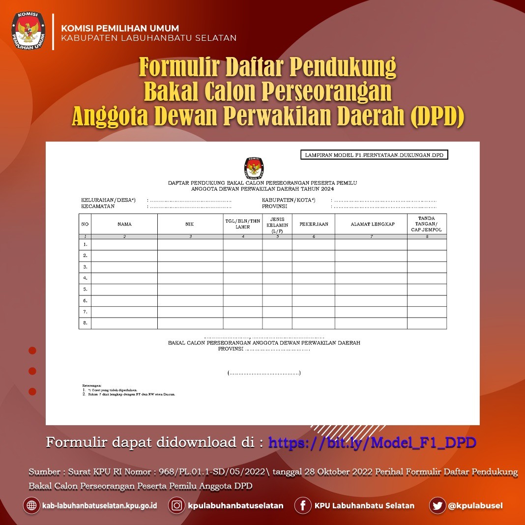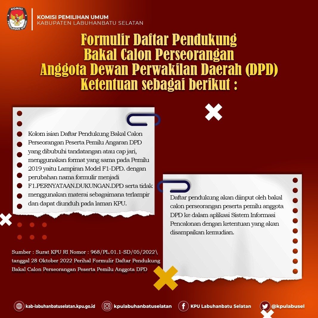 1270-Pengumuman Formulir Daftar Pendukung Bakal Calon Perseorangan Peserta Pemilu Anggota DPD Selasa, 01 November 2022 00:00 428 Formulir Dapat di Download disini. Bagikan: Telah dilihat 428 kali