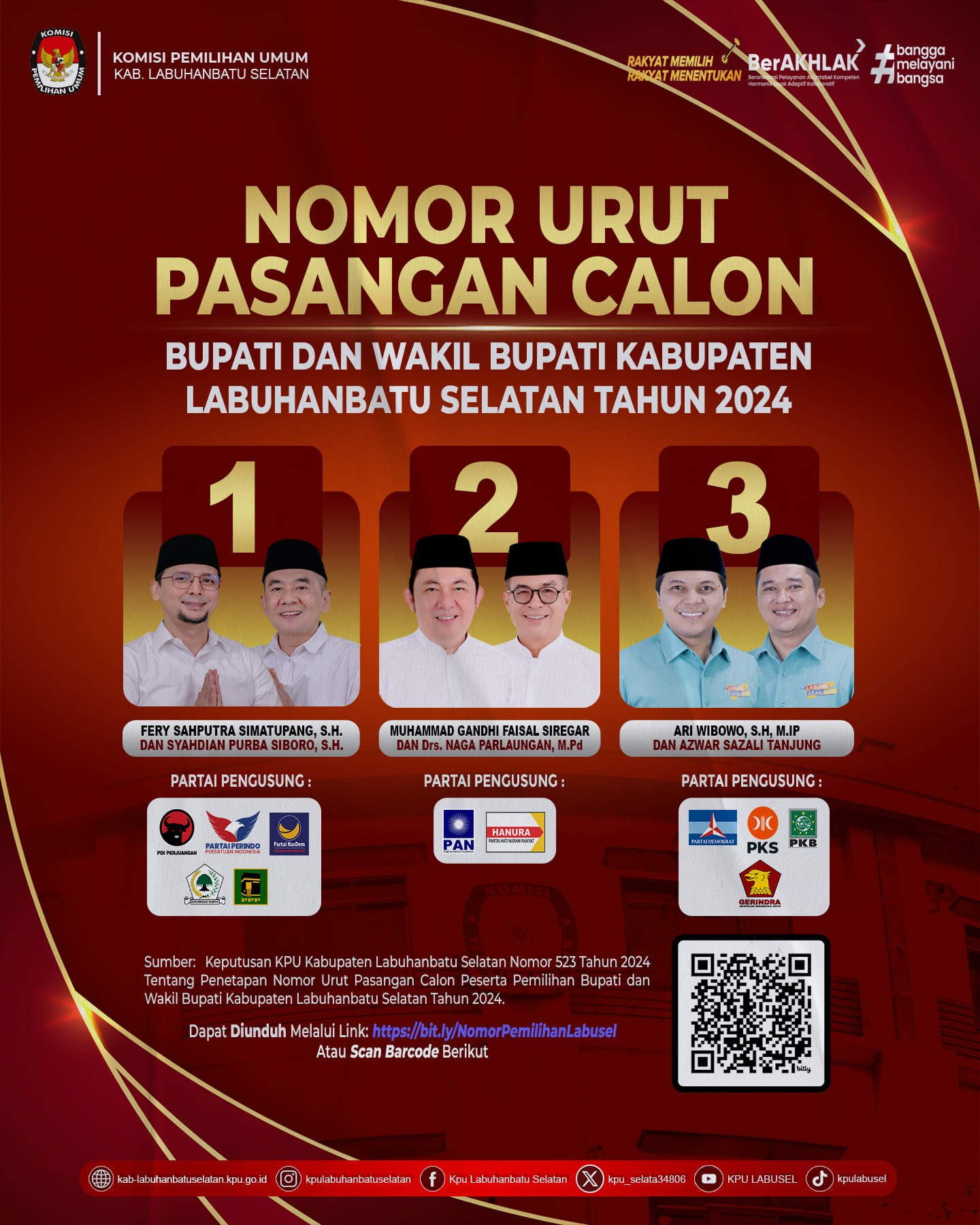 Sesuai dengan keputusan KPU Kab.Labuhanbatu Selatan Nomor 523 Tahun 2024 tentang Penetapan Nomor Urut Pasangan Calon Peserta Pemilihan Bupati dan Wakil Bupati Kabupaten Labuhanbatu Selatan Tahun 2024