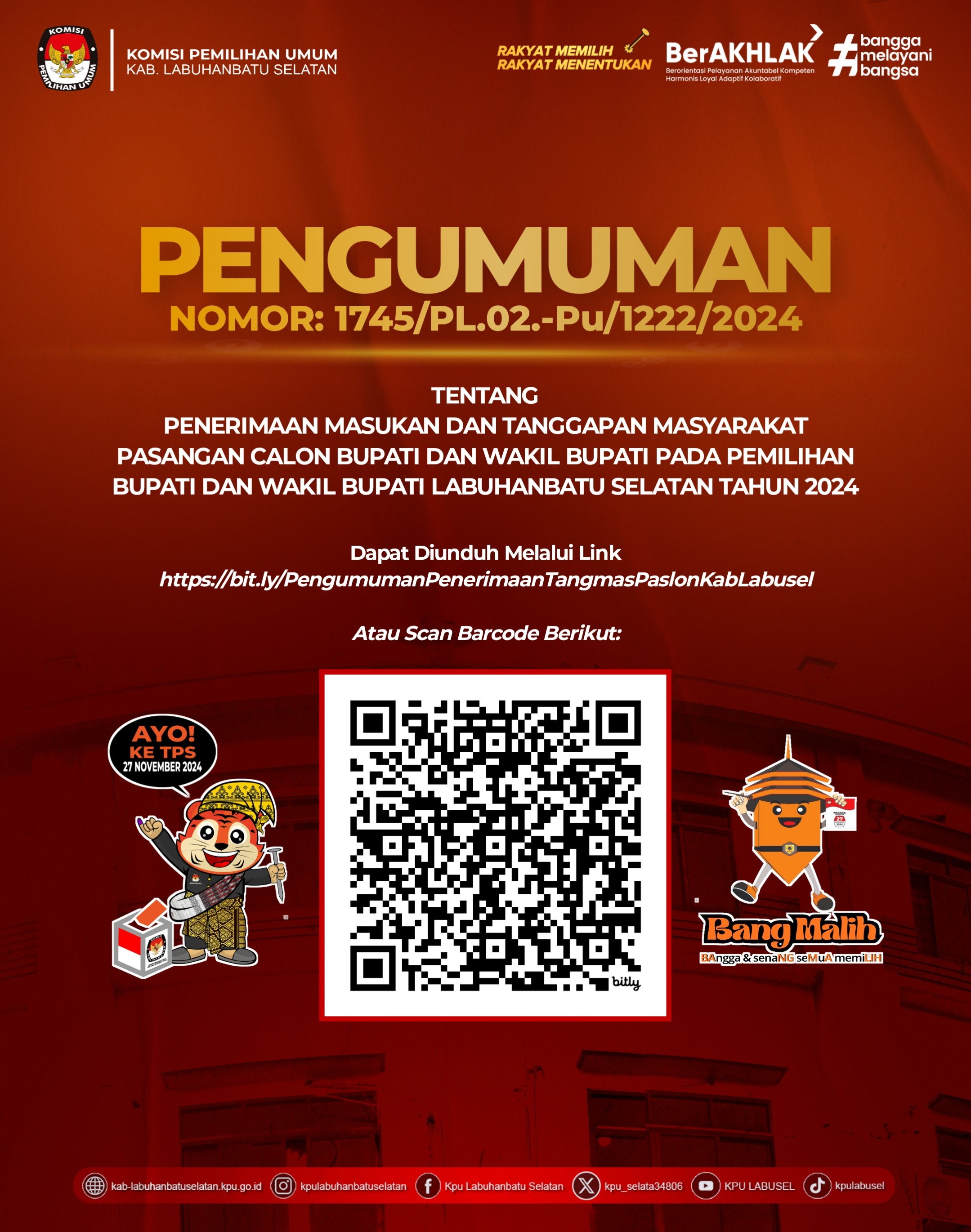 Pengumuman Tentang Penerimaan Masukan dan Tanggapan Masyarakat Pasangan Calon Bupati dan Wakil Bupati pada Pemilihan Bupati dan Wakil Bupati Labuhanbatu Selatan Tahun 2024 yang dapat diakses pada laman website KPU Kabupaten Labuhanbatu Selatan dan media sosial KPU Kabupaten Labuhanbatu Selatan atau dapat datang langsung Ke Kantor KPU Kabupaten Labuhanbatu Selatan. di alamat Jl. Bedagai Kelurahan Kotapinang, Kecamatan Kotapinang, Kabupaten Labuhanbatu Selatan.