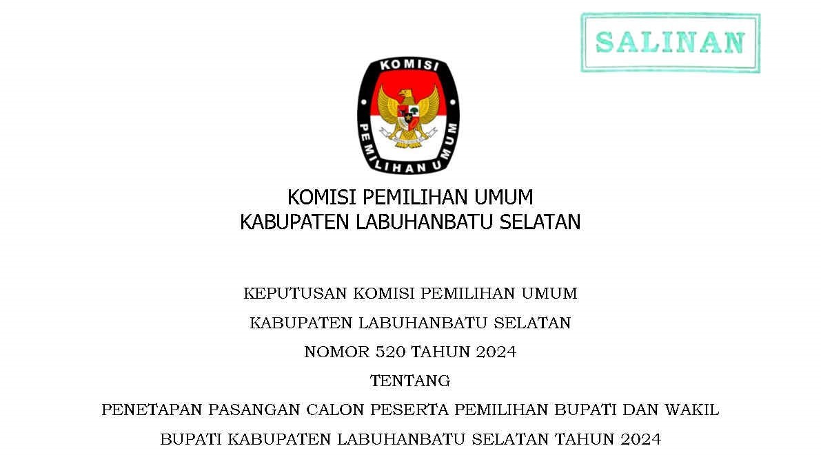 Download keputusan KPU Kab.Labuhanbatu Selatan Nomor 523 Tahun 2024 tentang Penetapan Nomor Urut Pasangan Calon Peserta Pemilihan Bupati dan Wakil Bupati Kabupaten Labuhanbatu Selatan Tahun 2024