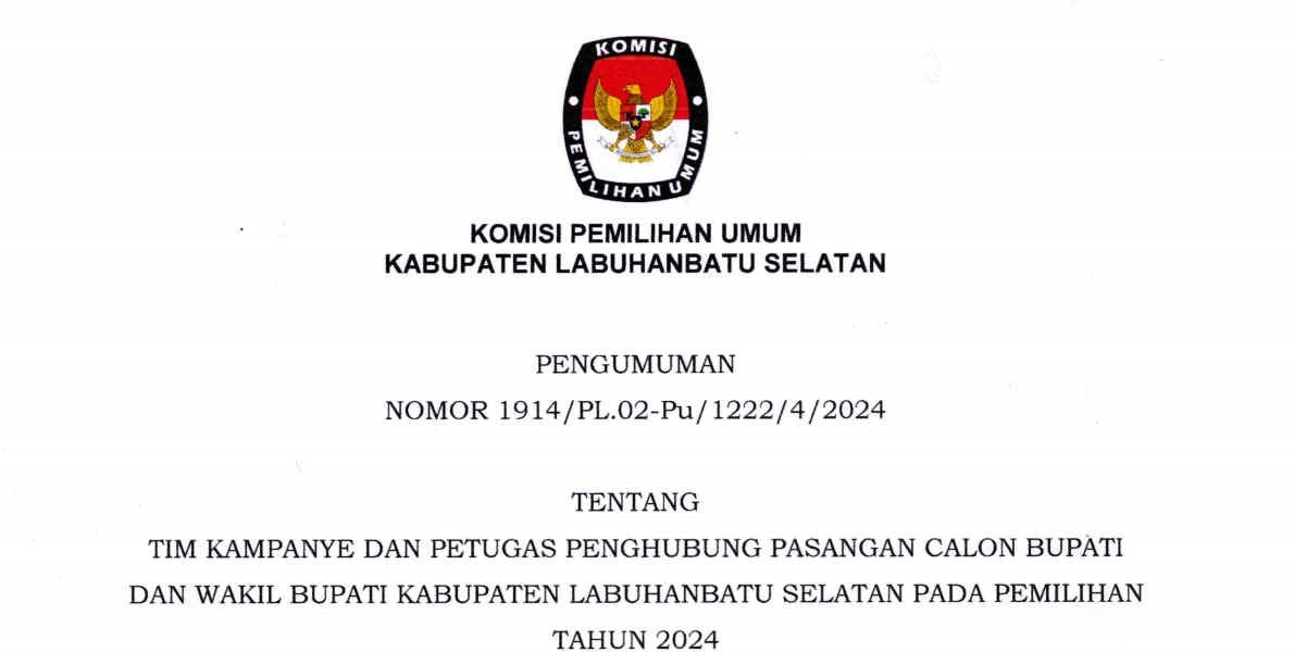 Sesuai dengan keputusan KPU Kab.Labuhanbatu Selatan Nomor 523 Tahun 2024 tentang Penetapan Nomor Urut Pasangan Calon Peserta Pemilihan Bupati dan Wakil Bupati Kabupaten Labuhanbatu Selatan Tahun 2024