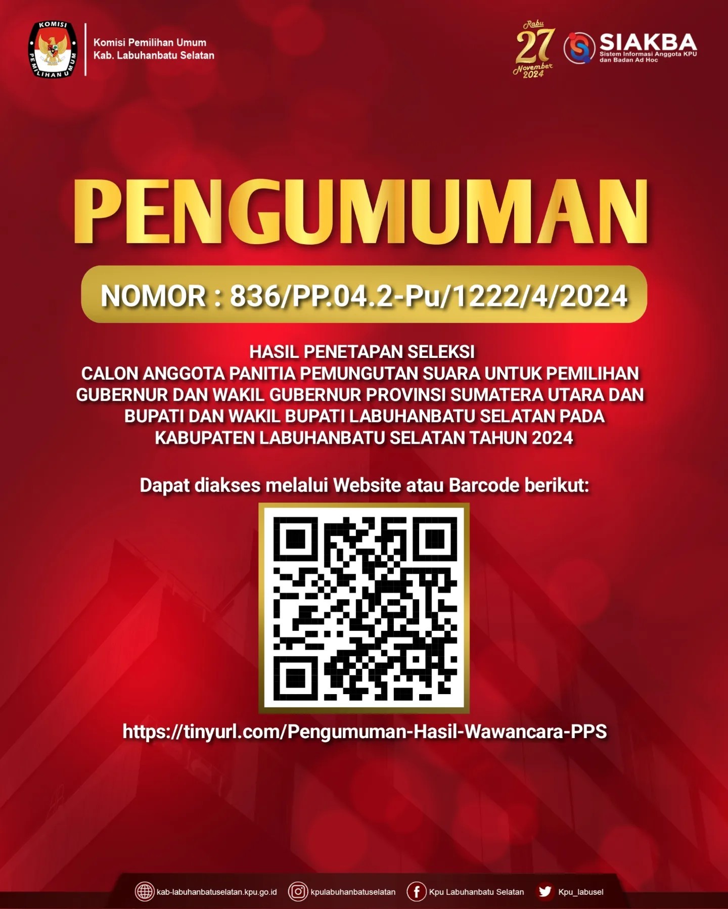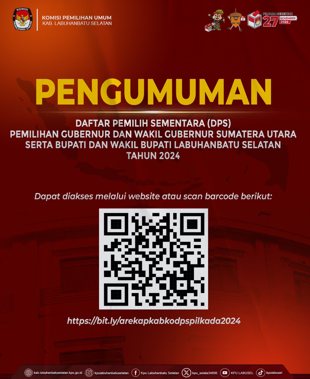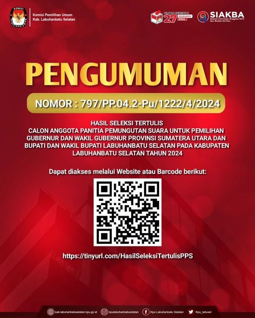 #TemanPemilih Berdasarkan ketentuan Pasal 137 Peraturan Komisi Pemilihan Umum Nomor 8 Tahun 2024 tentang Pencalonan Gubernur dan Wakil Gubernur, Bupati dan Wakil Bupati, serta Walikota dan Wakil Walikota yang telah diubah dengan Peraturan Komisi Pemilihan Umum Nomor 10 Tahun 2024 tentang Perubahan Atas Peraturan Komisi Pemilihan Umum Nomor 8 Tahun 2024 tentang Pencalonan Gubernur dan Wakil Gubernur, Bupati dan Wakil Bupati, serta Walikota dan Wakil Walikota, KPU Kabupaten Labuhanbatu Selatan mengumumkan hal-hal sebagai berikut:
