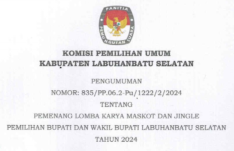PENGUMUMAN NOMOR: 1745/PL.02.2.-Pu/122/2024 TENTANG PENERIMAAN MASUKAN DAN TANGGAPAN MASYARAKAT PASANGAN CALON BUPATI DAN WAKIL BUPATI PADA PEMILIHAN BUPATI DAN WAKIL BUPATI LABUHANBATU SELATAN TAHUN 2024