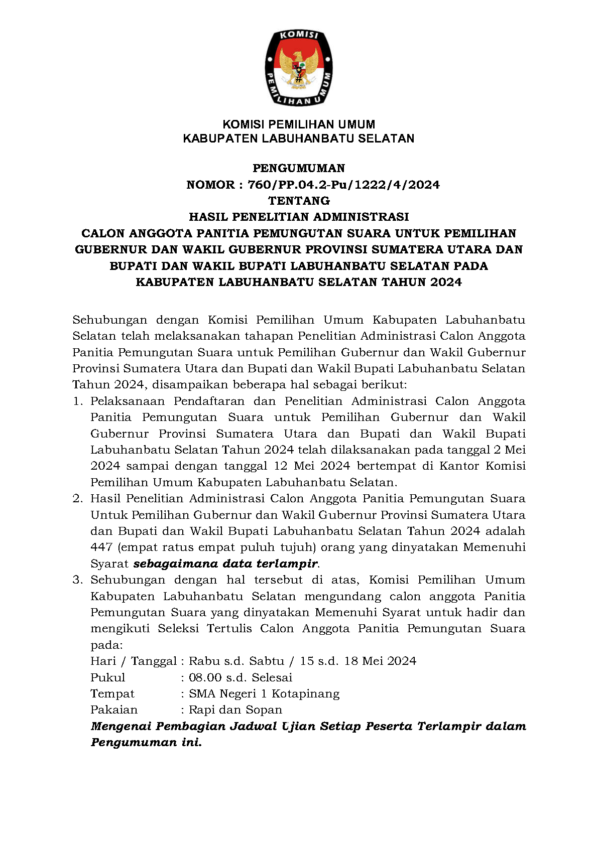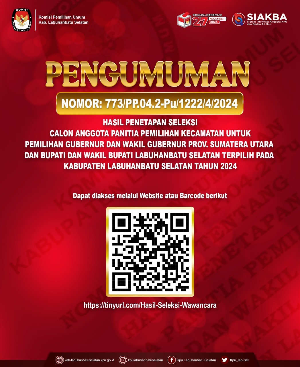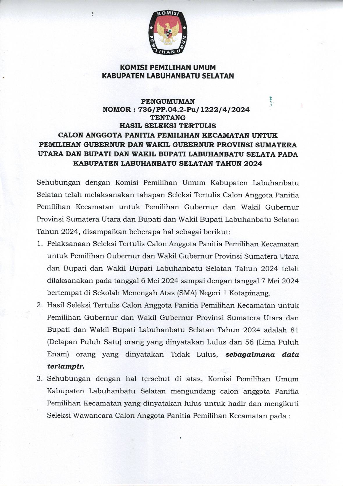 PENGUMUMAN NOMOR : 773/PP.04.2-Pu/1222/4/2024 TENTANG HASIL PENETAPAN SELEKSI CALON ANGGOTA PANITIA PEMILIHAN KECAMATAN UNTUK PEMILIHAN GUBERNUR DAN WAKIL GUBERNUR PROVINSI SUMATERA UTARA DAN BUPATI DAN WAKIL BUPATI LABUHANBATU SELATAN TERPILIH PADA KABUPATEN LABUHANBATU SELATAN TAHUN 2024.