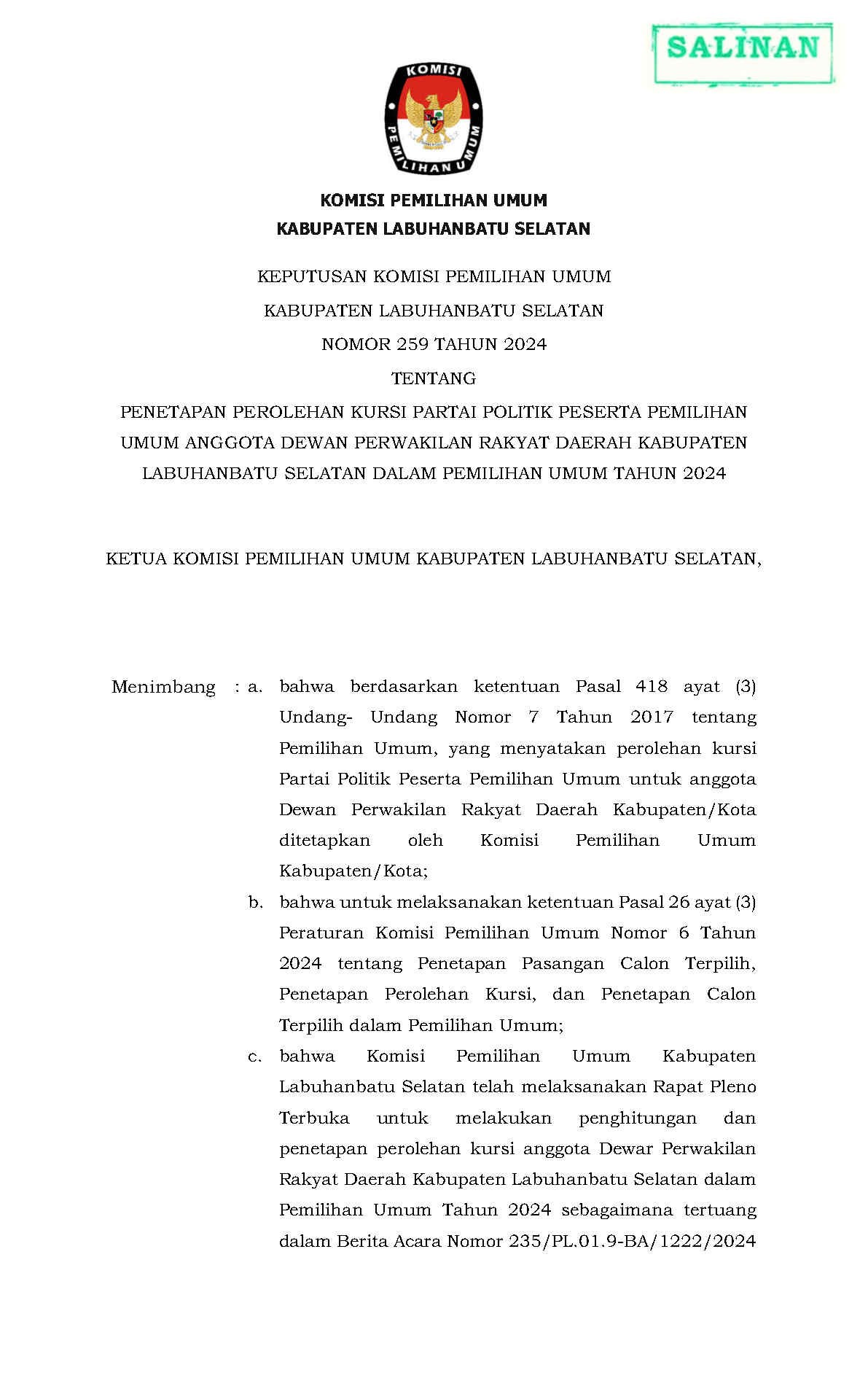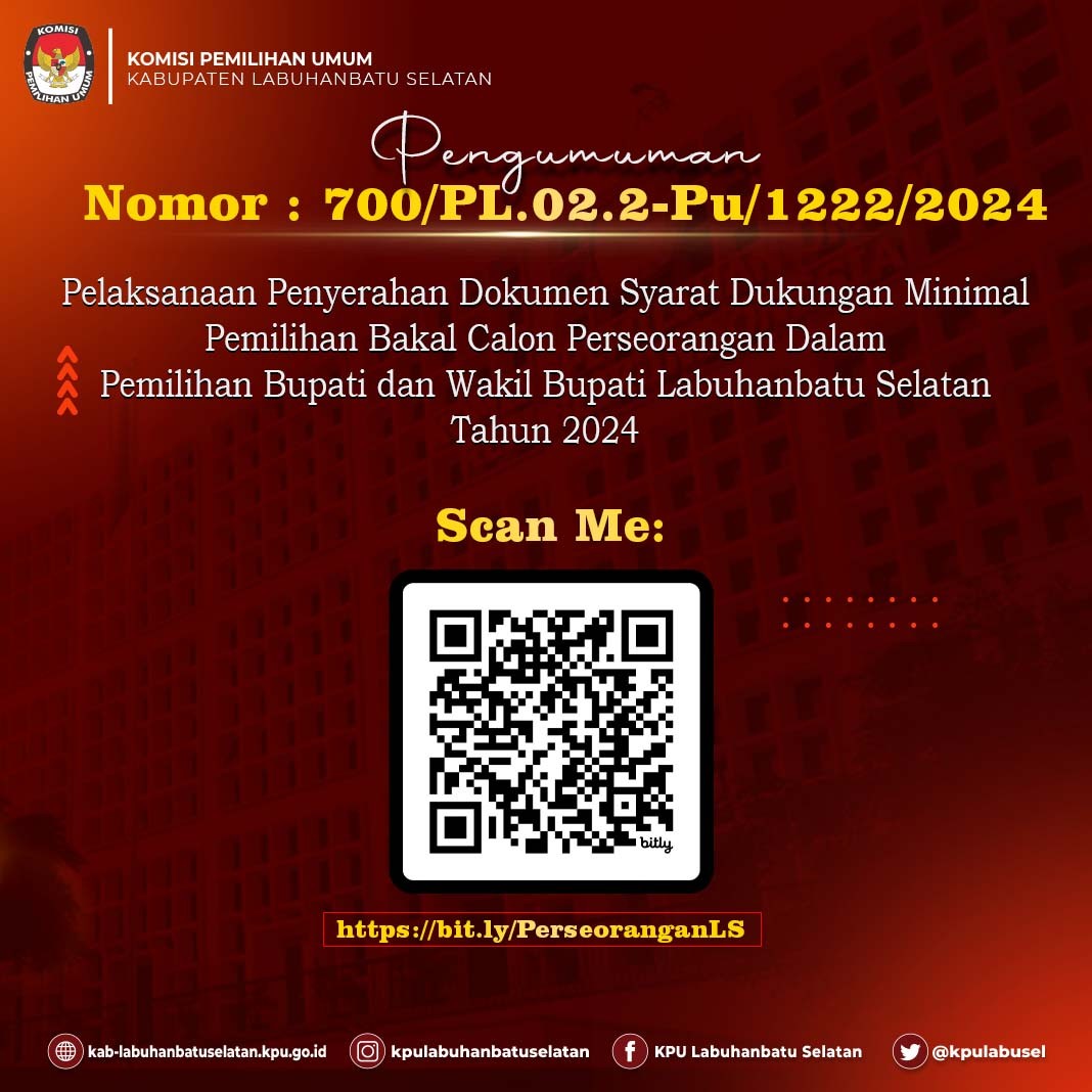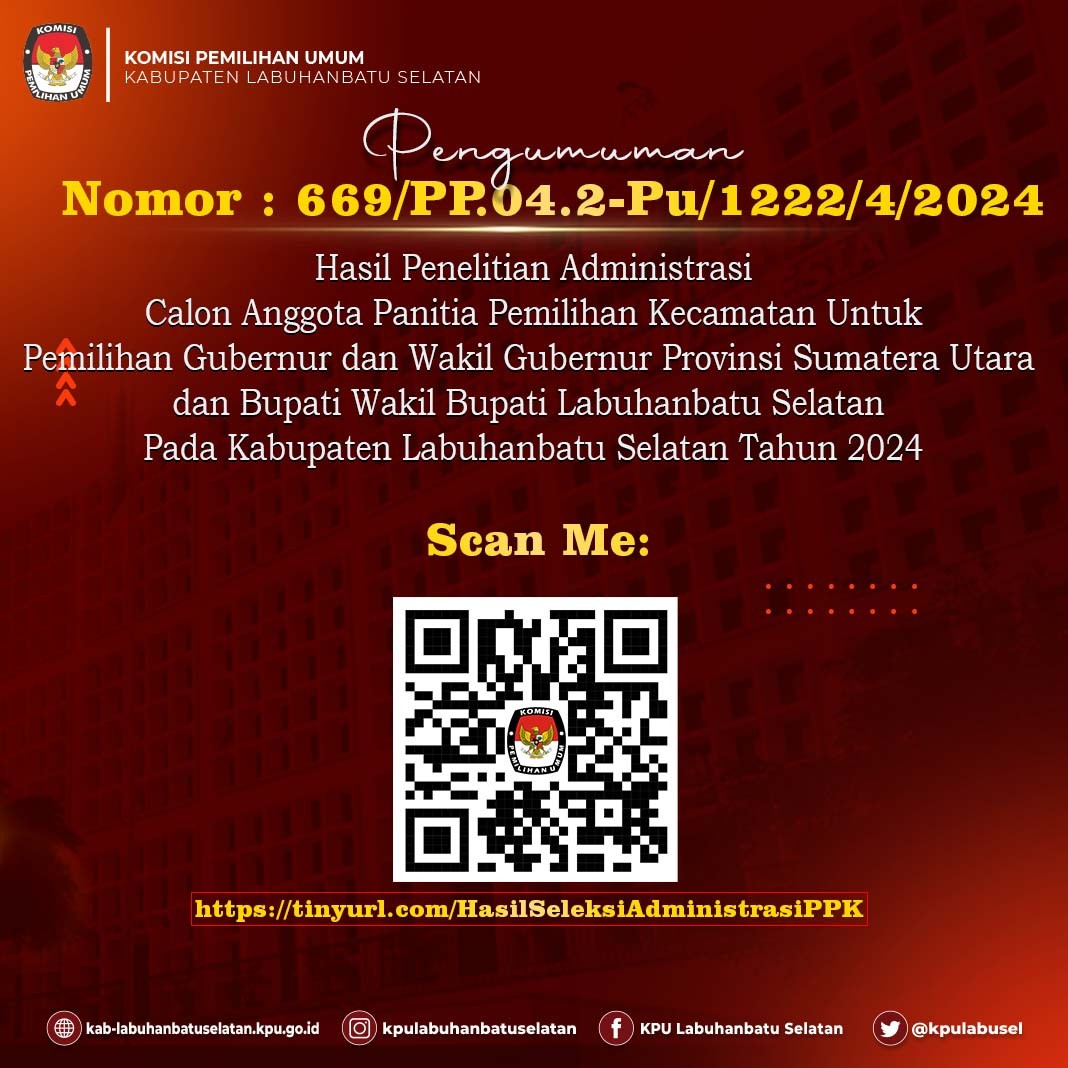 PENGUMUMAN NOMOR : 773/PP.04.2-Pu/1222/4/2024 TENTANG HASIL PENETAPAN SELEKSI CALON ANGGOTA PANITIA PEMILIHAN KECAMATAN UNTUK PEMILIHAN GUBERNUR DAN WAKIL GUBERNUR PROVINSI SUMATERA UTARA DAN BUPATI DAN WAKIL BUPATI LABUHANBATU SELATAN TERPILIH PADA KABUPATEN LABUHANBATU SELATAN TAHUN 2024.