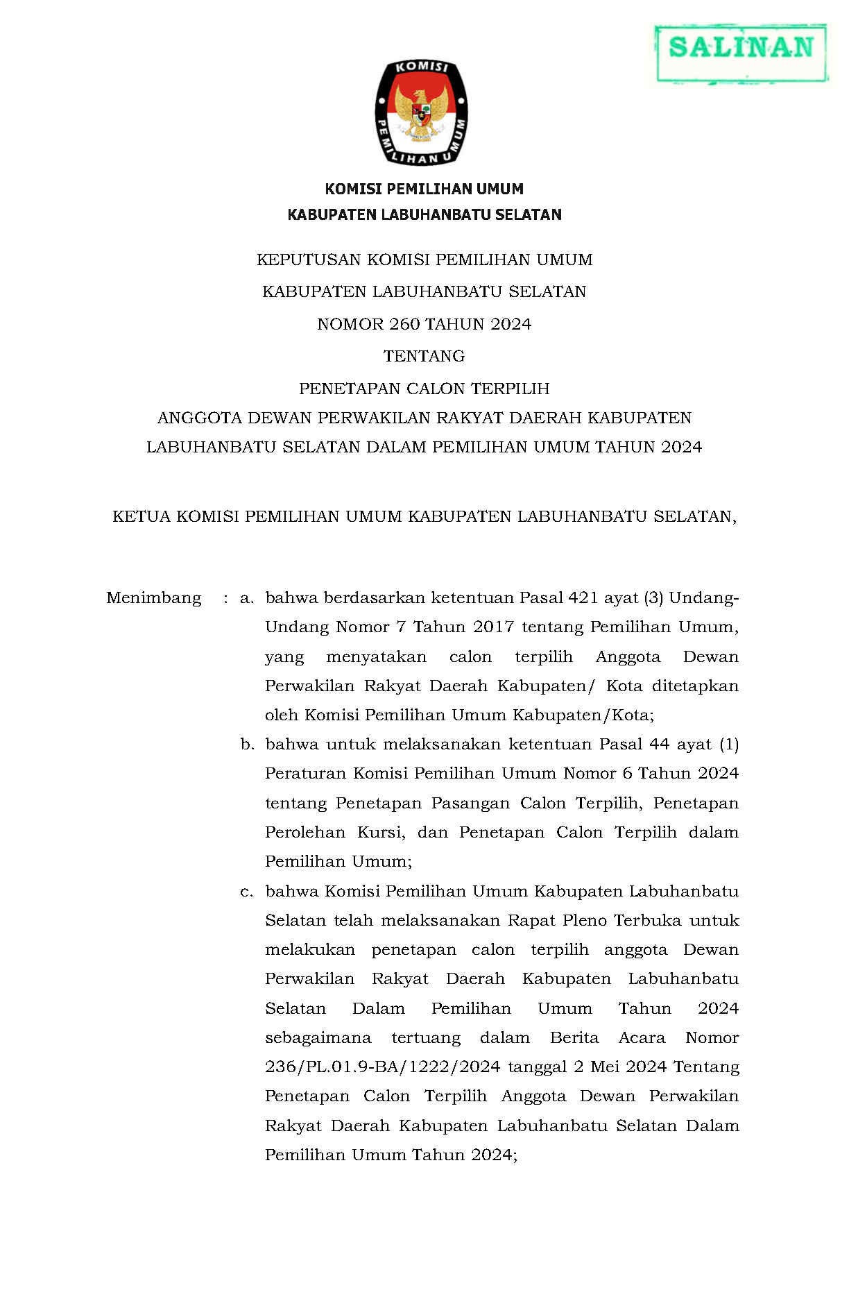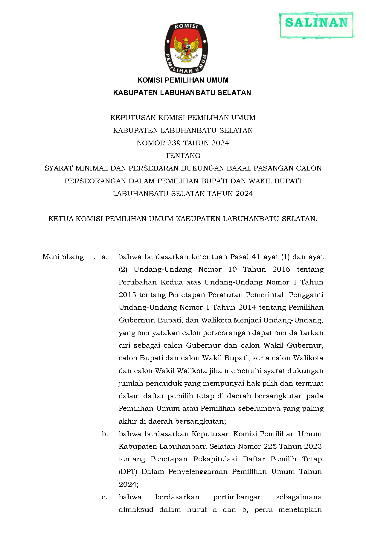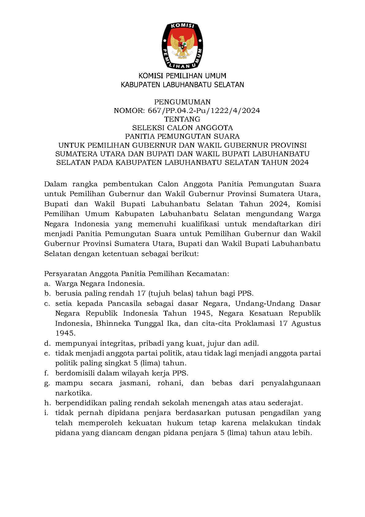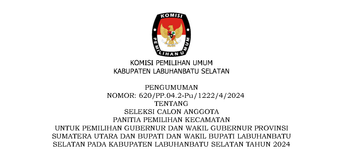 PENGUMUMAN NOMOR: 620/PP.04.2-Pu/1222/4/202 TENTANG SELEKSI CALON ANGGOTA PANITIA PEMILIHAN KECAMATAN UNTUK PEMILIHAN GUBERNUR DAN WAKIL GUBERNUR PROVINSI SUMATERA UTARA DAN BUPATI DAN WAKIL BUPATI LABUHANBATU SELATAN PADA KABUPATEN LABUHANBATU SELATAN TAHUN 2024.