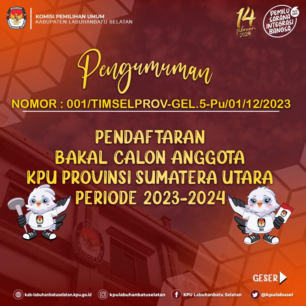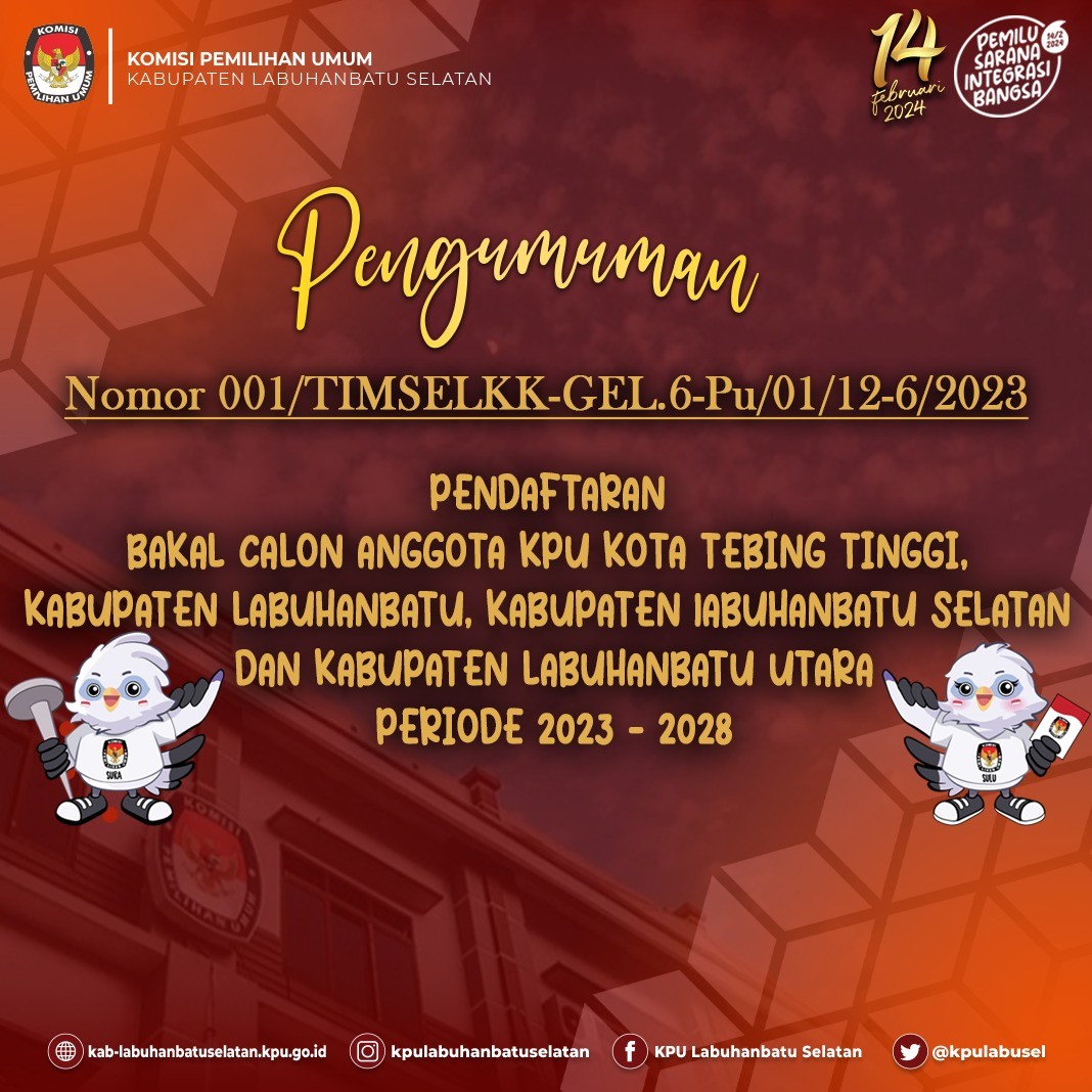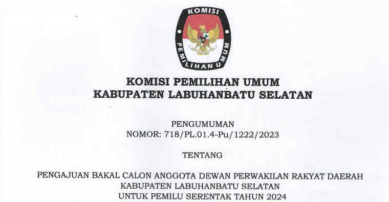 Pengumuman Nomor 718/PL.01.4-Pu/1222/2023 Tentang Pengajuan Bakal Calon Anggota Dewan Perwakilan Rakyat Daerah Kabupaten Labuhanbatu Selatan Untuk Pemilu Serentak Tahun 2024.