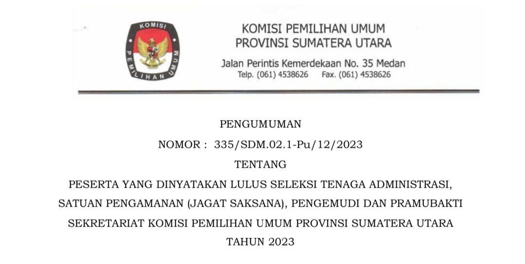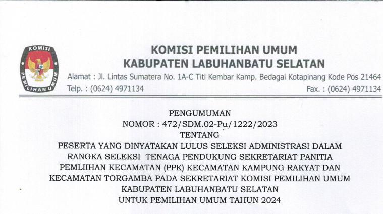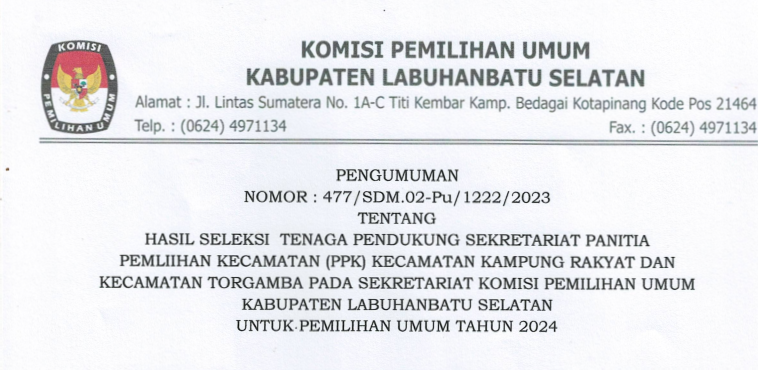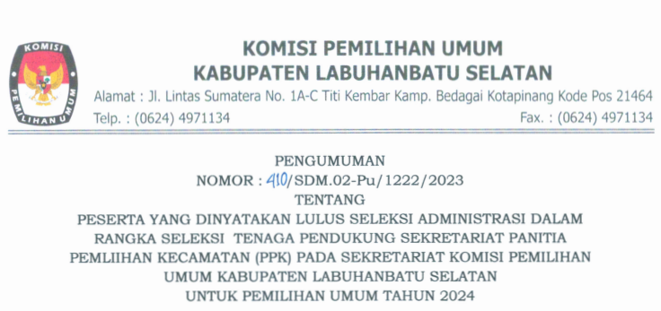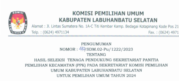 Berdasarkan Pengumuman Hasil Seleksi Tenaga Pendukung Sekretariat Panitia Pemilihan Kecamatan (PPK) Pada Sekretariat Komisi Pemilihan Umum Kabupaten Labuhanbatu Selatan Untuk Pemilihan Umum Tahun 2024 Nomor : 442/SDM.02-Pu/1222/2023 tanggal 8 Maret 2023, disampaikan hal-hal sebagai berikut :