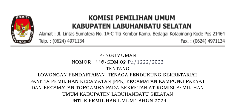 Pengumuman Nomor 446/SDM.02-Pu/1222/2023 Tentang Lowongan Pendaftaran Tenaga Pendukung Sekretariat Panitia Pemilihan Kecamatan (PPK) Kecamatan Kampung Rakyat Dan Kecamatan Torgamba Pada Sekretariat Komisi Pemilhan Umum Kabupaten Labuhanbatu Selatan Untuk Pemilihan Umum Tahun 2024.