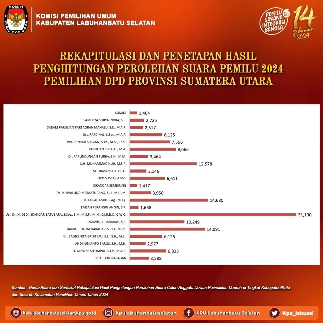 Hasil Perolehan Suara Pemilihan DPD Dapil SUMUT di Kabupaten Labuhanbatu Selatan Pada Pemilu Tahun 2024 D Hasil kabupaten-DPD dapat diunduh disini. Share this artikel : Dilihat 186 Kali.